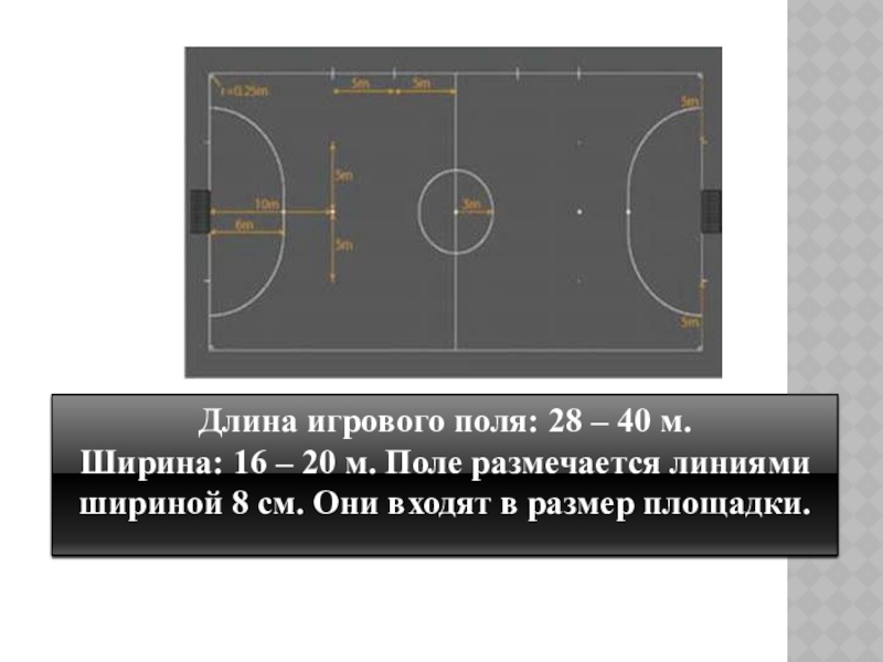 Слайд 3Длина игрового поля: 28 – 40 м.