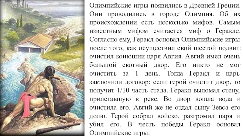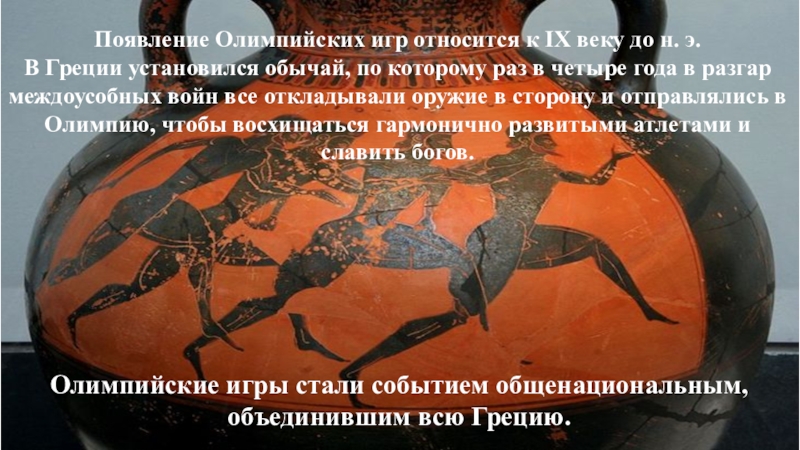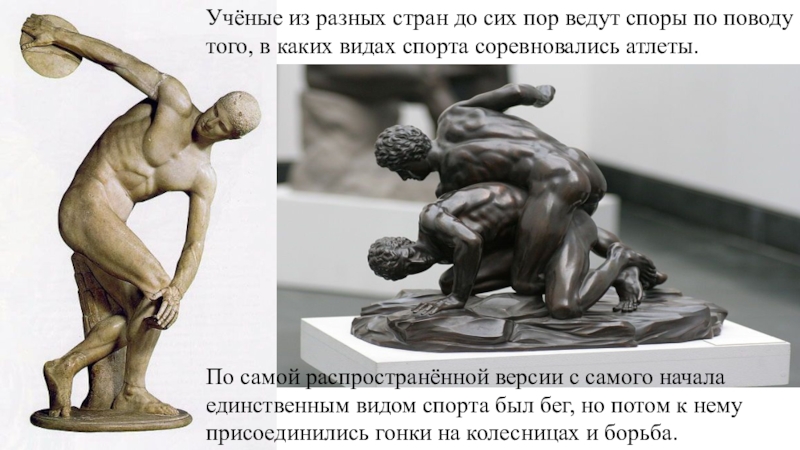 По самой распространённой версии с самого начала единственным видом спорта был бег, но потом к нему присоединились гонки на колесницах и борьба.