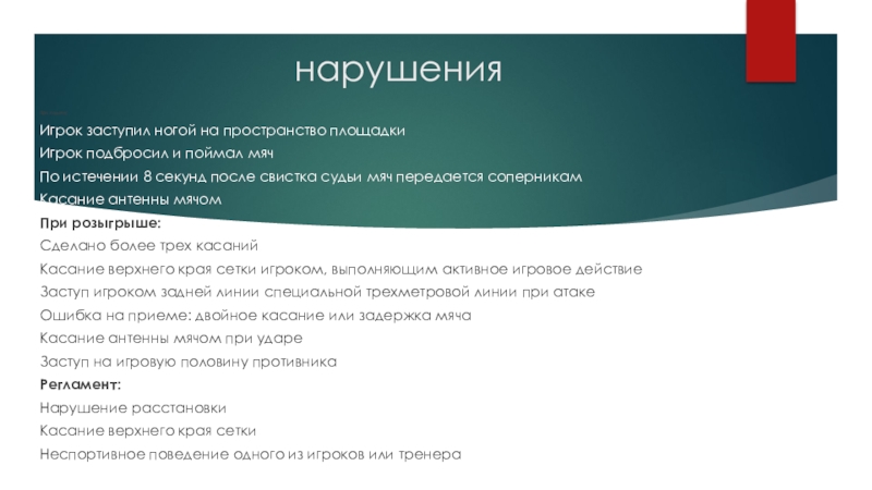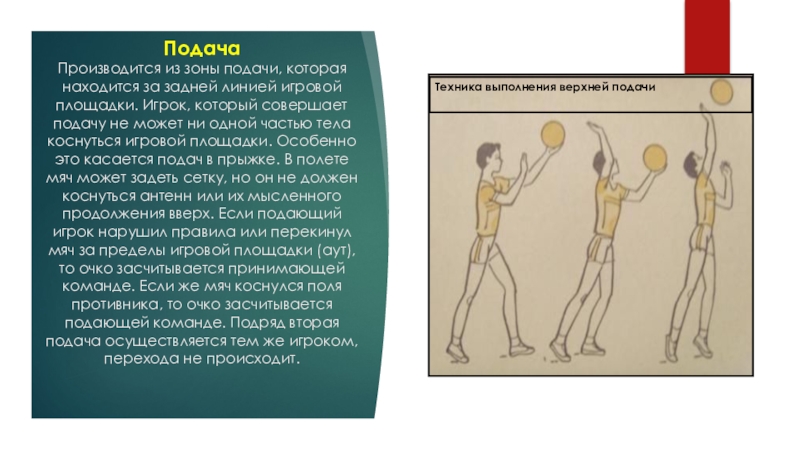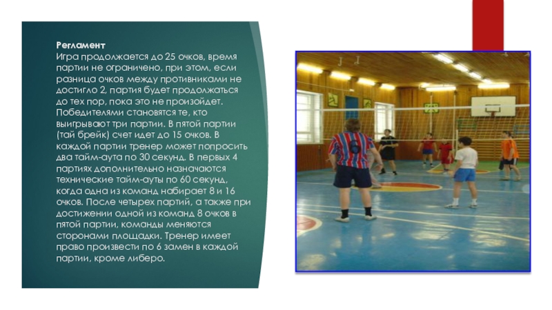 если разница очков между противниками не достигло 2, партия будет продолжаться до тех пор, пока это не произойдет. Победителями становятся те, кто выигрывают три партии. В пятой партии (тай брейк) счет идет до 15 очков. В каждой партии тренер может попросить два тайм-аута по 30 секунд. В первых 4 партиях дополнительно назначаются технические тайм-ауты по 60 секунд, когда одна из команд набирает 8 и 16 очков. После четырех партий, а также при достижении одной из команд 8 очков в пятой партии, команды меняются сторонами площадки. Тренер имеет право произвести по 6 замен в каждой партии, кроме либеро.
