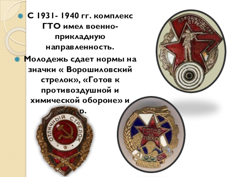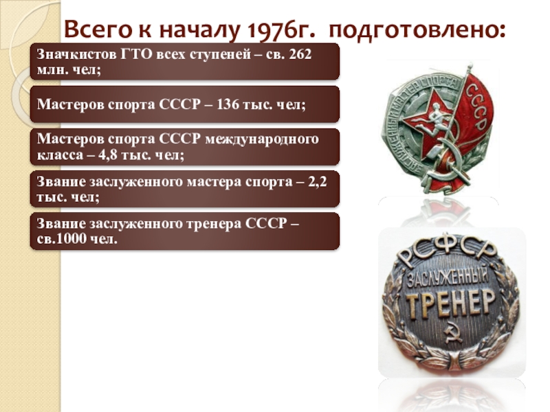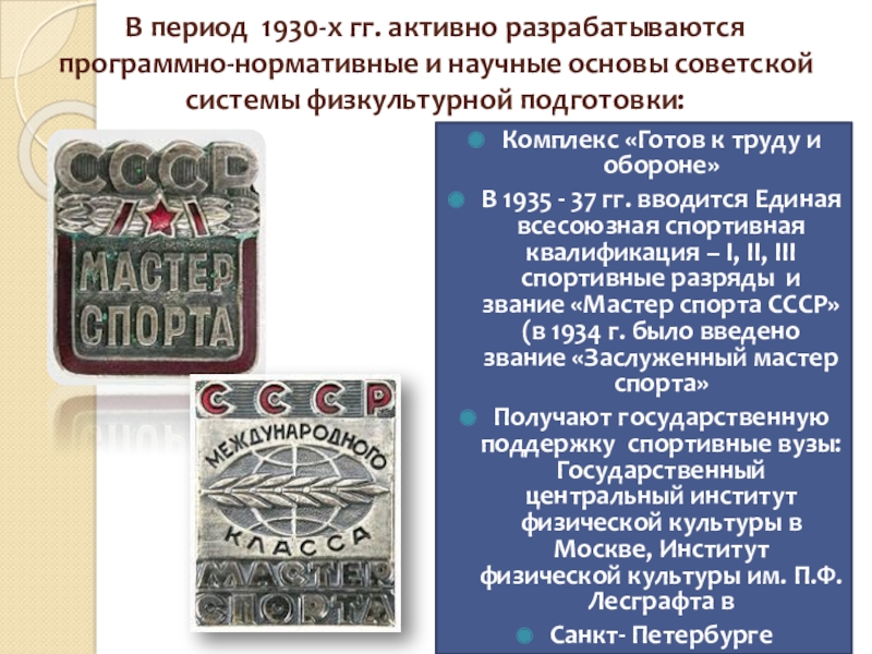 В 1935 - 37 гг. вводится Единая всесоюзная спортивная квалификация – I, II, III спортивные разряды и звание «Мастер спорта СССР»(в 1934 г. было введено звание «Заслуженный мастер спорта»