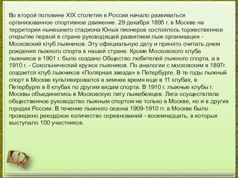 движение. 29 декабря 1895 г. в Москве на территории нынешнего стадиона Юных пионеров состоялось торжественное открытие первой в стране руководящей развитием лыж организации - Московский клуб лыжников. Эту официальную дату и принято считать днем рождения лыжного спорта в нашей стране. Кроме Московского клуба лыжников в 1901 г. было создано Общество любителей лыжного спорта, а в 1910 г. - Сокольнический кружок лыжников. По аналогии с московским в 1897г. создается клуб лыжников «Полярная звезда» в Петербурге. В те годы лыжный спорт в Москве культивировался в зимнее время еще в 11 клубах, в Петербурге в 8 клубах по другим видам спорта. В 1910 г. лыжные клубы г.Москвы объединились в Московскую лигу лыжебежцев. Лига осуществляла общественное руководство лыжным спортом не только в Москве, но и в других городах России. В течение лыжного сезона 1909-1910 гг. в Москве было проведено рекордное количество соревнований - восемнадцать, в которых выступало 100 участников.