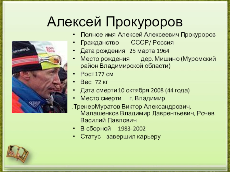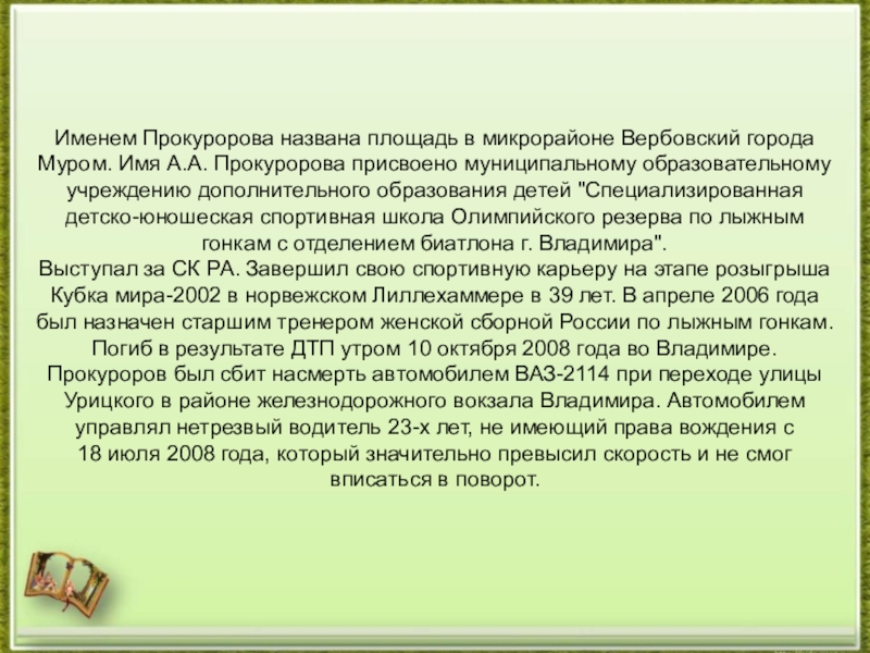 Прокуророва присвоено муниципальному образовательному учреждению дополнительного образования детей "Специализированная детско-юношеская спортивная школа Олимпийского резерва по лыжным гонкам с отделением биатлона г. Владимира".