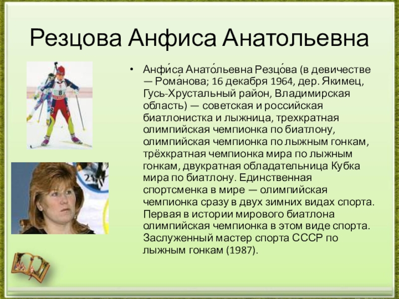 1964, дер. Якимец, Гусь-Хрустальный район, Владимирская область) — советская и российская биатлонистка и лыжница, трехкратная олимпийская чемпионка по биатлону, олимпийская чемпионка по лыжным гонкам, трёхкратная чемпионка мира по лыжным гонкам, двукратная обладательница Кубка мира по биатлону. Единственная спортсменка в мире — олимпийская чемпионка сразу в двух зимних видах спорта. Первая в истории мирового биатлона олимпийская чемпионка в этом виде спорта. Заслуженный мастер спорта СССР по лыжным гонкам (1987).