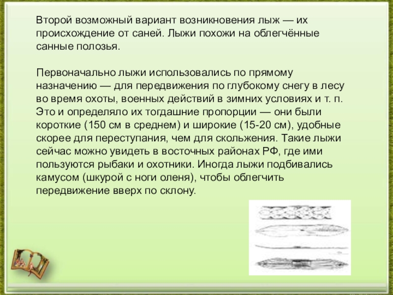 Слайд 8Второй возможный вариант возникновения лыж — их происхождение от саней. Лыжи