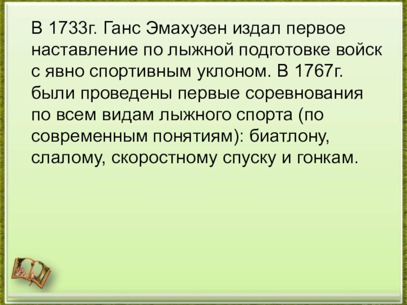 Слайд 10В 1733г. Ганс Эмахузен издал первое наставление по лыжной подготовке войск