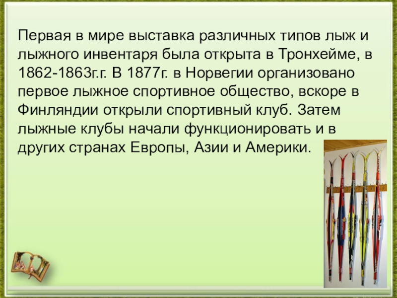 Слайд 11Первая в мире выставка различных типов лыж и лыжного инвентаря была