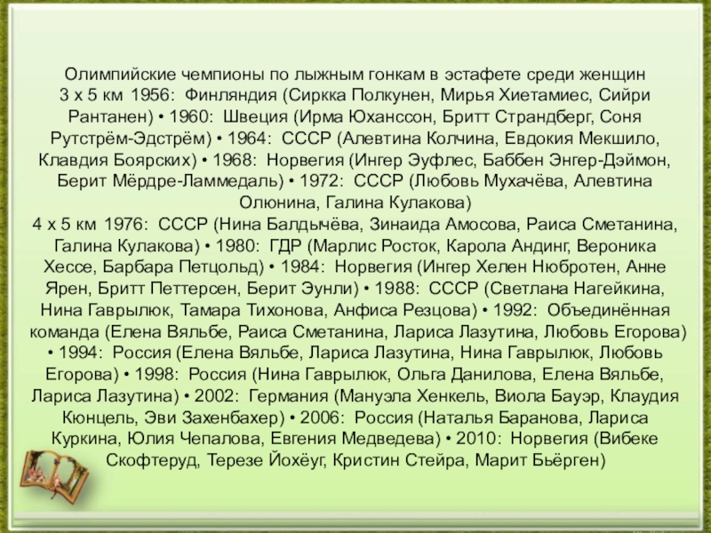 Слайд 23Олимпийские чемпионы по лыжным гонкам в эстафете среди женщин