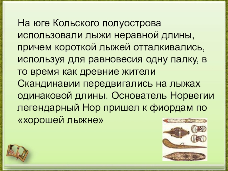 Слайд 5На юге Кольского полуострова использовали лыжи неравной длины, причем короткой лыжей