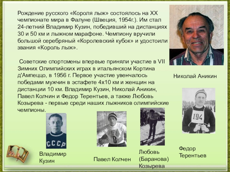 Советские спортсмены впервые приняли участие в VII Зимних Олимпийских играх в итальянском Кортина д'Ампеццо, в 1956 г. Первое участие увенчалось победами мужчин в эстафете 4х10 км и женщин на дистанции 10 км. Владимир Кузин, Николай Аникин, Павел Колчин и Федор Терентьев, а также Любовь Козырева - первые среди наших лыжников олимпийские чемпионы.