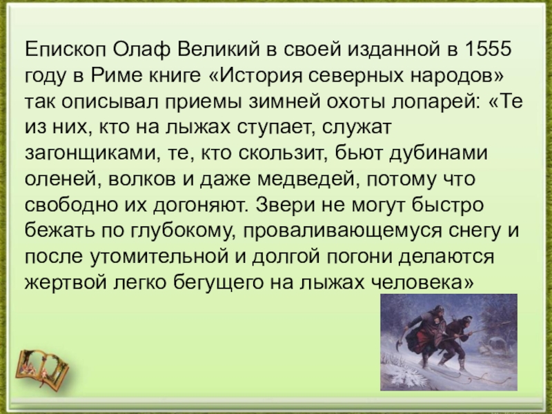 книге «История северных народов» так описывал приемы зимней охоты лопарей: «Те из них, кто на лыжах ступает, служат загонщиками, те, кто скользит, бьют дубинами оленей, волков и даже медведей, потому что свободно их догоняют. Звери не могут быстро бежать по глубокому, проваливающемуся снегу и после утомительной и долгой погони делаются жертвой легко бегущего на лыжах человека»