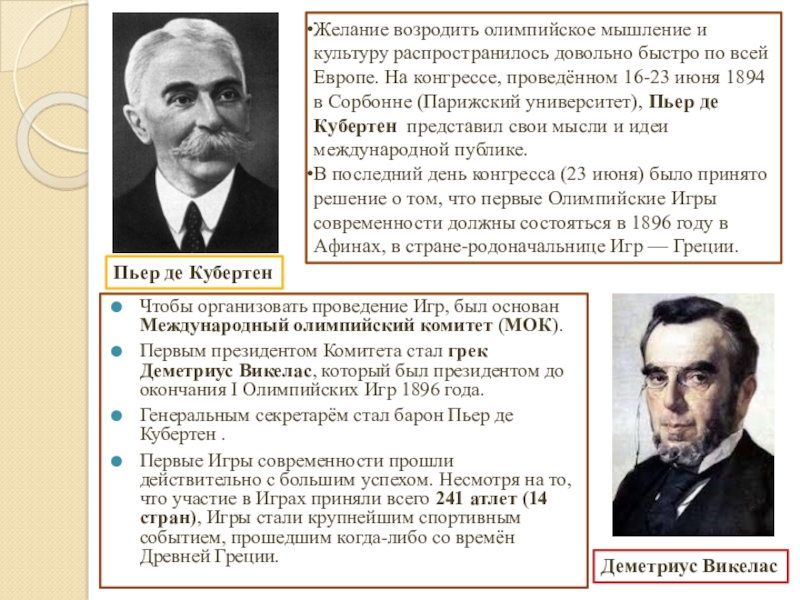 Желание возродить олимпийское мышление и культуру распространилось довольно быстро по всей Европе. На конгрессе, проведённом 16-23 июня 1894 в Сорбонне (Парижский университет), Пьер де Кубертен представил свои мысли и идеи международной публике.