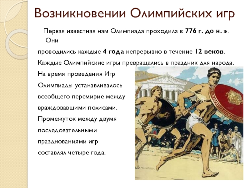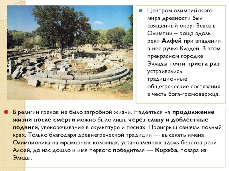 В религии греков не было загробной жизни. Надеяться на продолжение жизни после смерти можно было лишь через славу и доблестные подвиги, увековечивание в скульптуре и песнях. Проигрыш означал полный крах. Только благодаря древнегреческой традиции — высекать имена Олимпионика на мраморных колоннах, установленных вдоль берегов реки Алфей, до нас дошло и имя первого победителя — Корэба, повара из Элиды.
