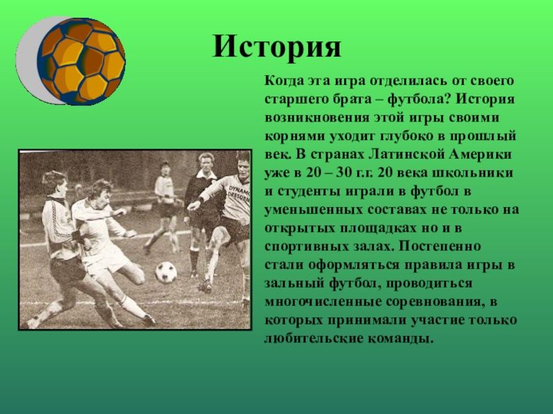 возникновения этой игры своими корнями уходит глубоко в прошлый век. В странах Латинской Америки уже в 20 – 30 г.г. 20 века школьники и студенты играли в футбол в уменьшенных составах не только на открытых площадках но и в спортивных залах. Постепенно стали оформляться правила игры в зальный футбол, проводиться многочисленные соревнования, в которых принимали участие только любительские команды.