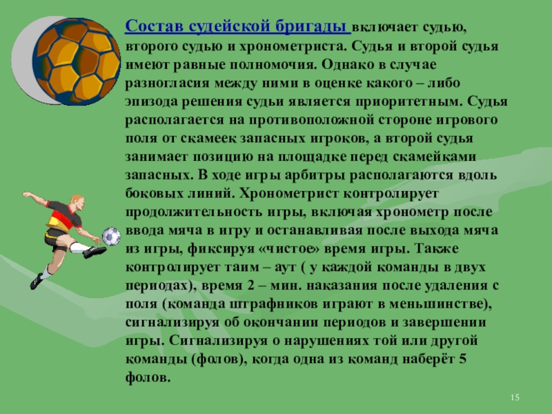 второй судья имеют равные полномочия. Однако в случае разногласия между ними в оценке какого – либо эпизода решения судьи является приоритетным. Судья располагается на противоположной стороне игрового поля от скамеек запасных игроков, а второй судья занимает позицию на площадке перед скамейками запасных. В ходе игры арбитры располагаются вдоль боковых линий. Хронометрист контролирует продолжительность игры, включая хронометр после ввода мяча в игру и останавливая после выхода мяча из игры, фиксируя «чистое» время игры. Также контролирует таим – аут ( у каждой команды в двух периодах), время 2 – мин. наказания после удаления с поля (команда штрафников играют в меньшинстве), сигнализируя об окончании периодов и завершении игры. Сигнализируя о нарушениях той или другой команды (фолов), когда одна из команд наберёт 5 фолов.