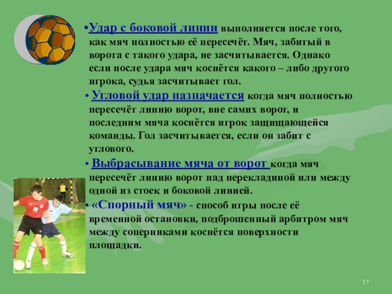 Особенность мяча для игры в мини –футбол (футзал) – небольшой отскок от поверхности площадки, что позволяет ему длительное время не покидать пределы игрового поля. Мяч считается вышедшим из игры, если он полностью пересечёт линию ворот или боковую линию поля. Если же мяч катится по линии или хотя бы его проекция какой – либо частью находится на этой линии он считается вне игры. А аналогично определяется и взятие ворот.