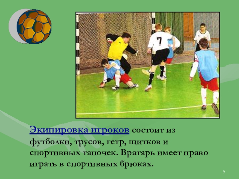 Экипировка игроков состоит из футболки, трусов, гетр, щитков и спортивных тапочек.