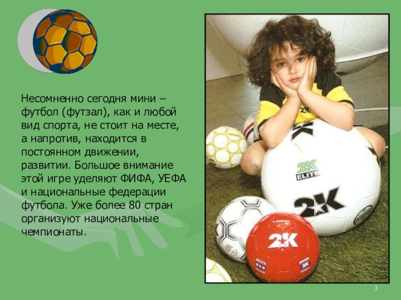 не стоит на месте, а напротив, находится в постоянном движении, развитии. Большое внимание этой игре уделяют ФИФА, УЕФА и национальные федерации футбола. Уже более 80 стран организуют национальные чемпионаты.