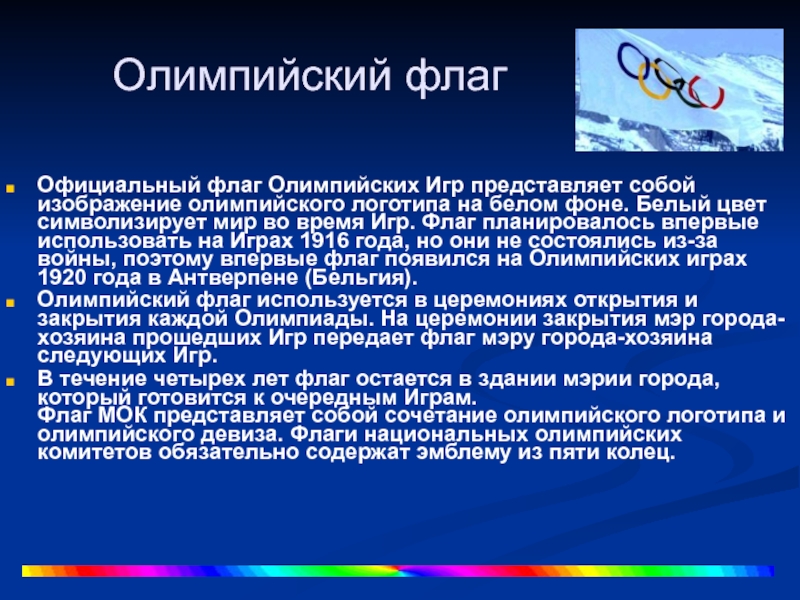 белом фоне. Белый цвет символизирует мир во время Игр. Флаг планировалось впервые использовать на Играх 1916 года, но они не состоялись из-за войны, поэтому впервые флаг появился на Олимпийских играх 1920 года в Антверпене (Бельгия).