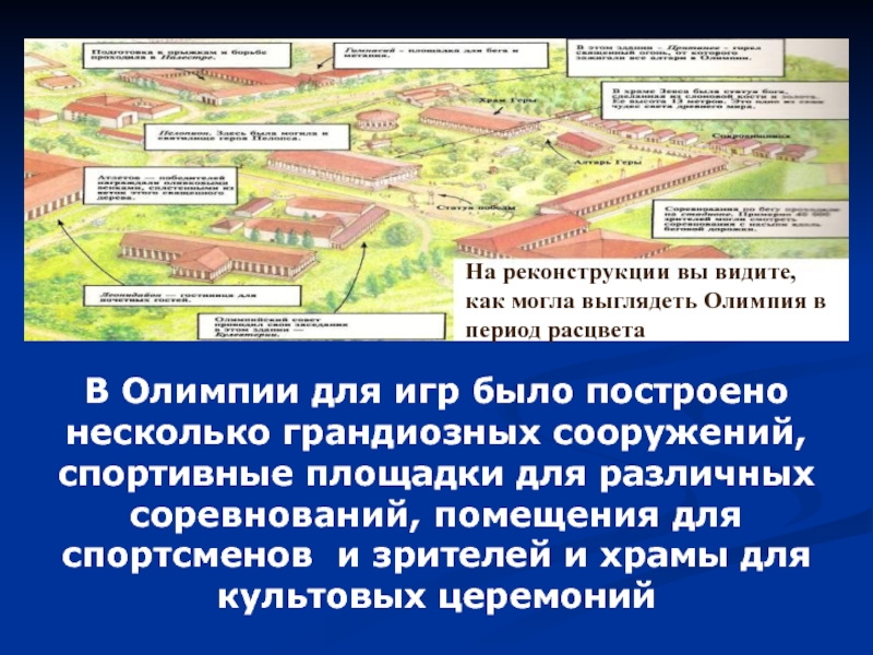 Слайд 6В Олимпии для игр было построено несколько грандиозных сооружений, спортивные площадки