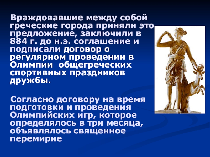 в 884 г. до н.э. соглашение и подписали договор о регулярном проведении в Олимпии общегреческих спортивных праздников дружбы.