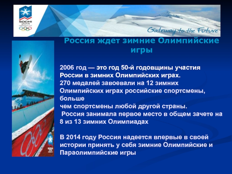 В 2014 году Россия надеется впервые в своей истории принять у себя зимние Олимпийские и Параолимпийские игры