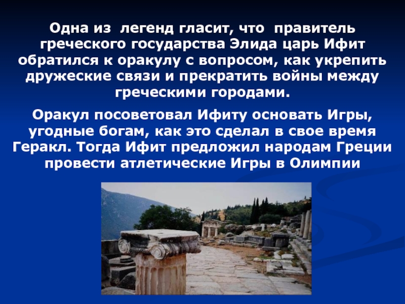 Слайд 4Одна из легенд гласит, что правитель греческого государства Элида царь Ифит