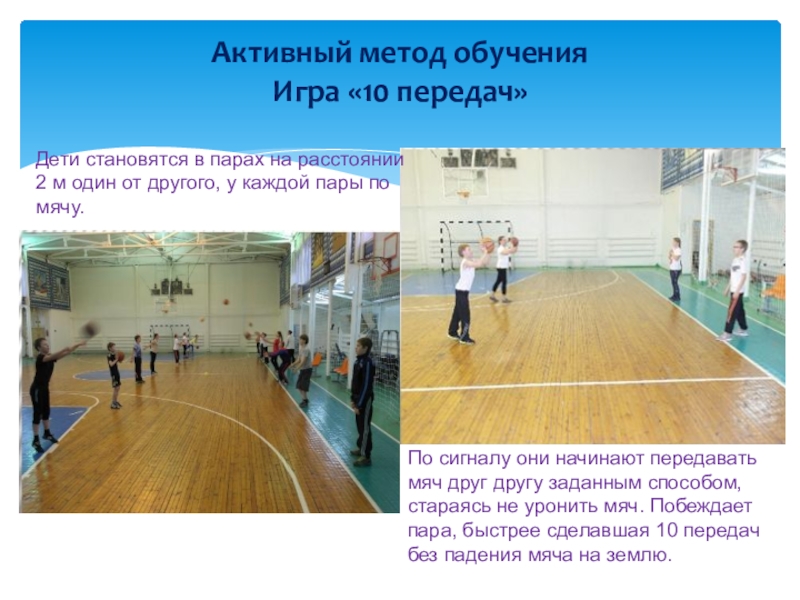 По сигналу они начинают передавать мяч друг другу заданным способом, стараясь не уронить мяч. Побеждает пара, быстрее сделавшая 10 передач без падения мяча на землю.