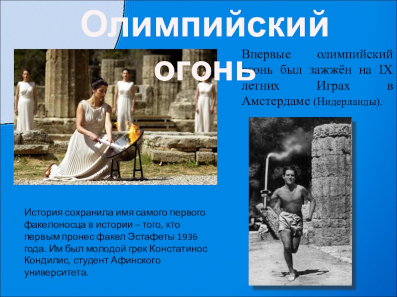 История сохранила имя самого первого факелоносца в истории – того, кто первым пронес факел Эстафеты 1936 года. Им был молодой грек Констатинос Кондилис, студент Афинского университета.