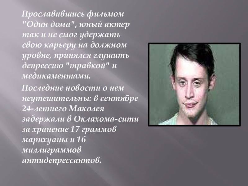 Последние новости о нем неутешительны: в сентябре 24-летнего Маколея задержали в Оклахома-сити за хранение 17 граммов марихуаны и 16 миллиграммов антидепрессантов.