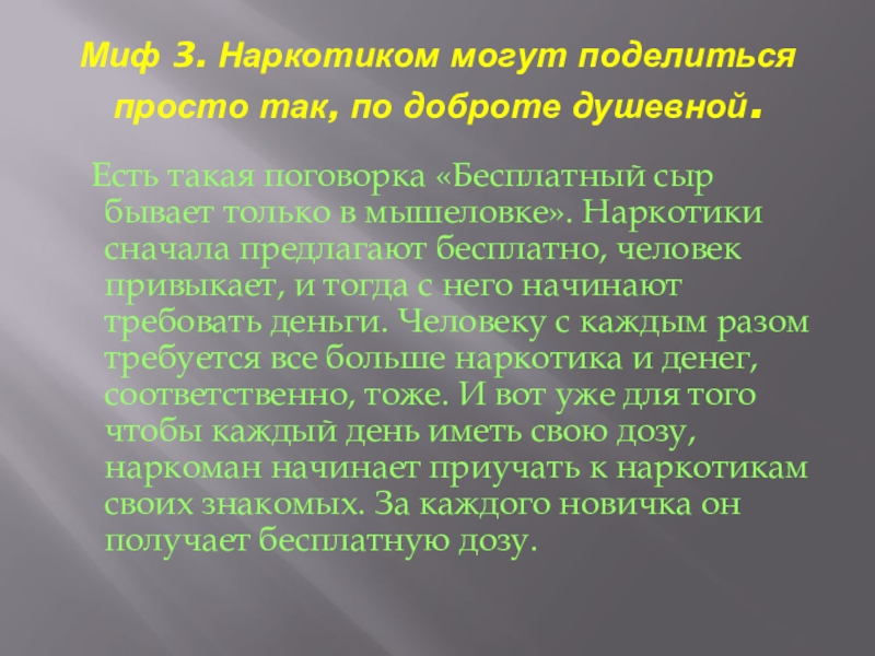 Слайд 19Миф 3. Наркотиком могут поделиться просто так, по доброте душевной.