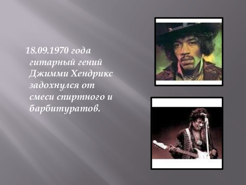 Слайд 9 18.09.1970 года гитарный гений Джимми Хендрикс задохнулся от смеси
