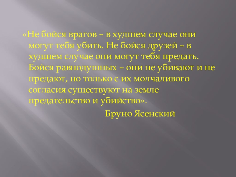 убить. Не бойся друзей – в худшем случае они могут тебя предать. Бойся равнодушных – они не убивают и не предают, но только с их молчаливого согласия существуют на земле предательство и убийство».