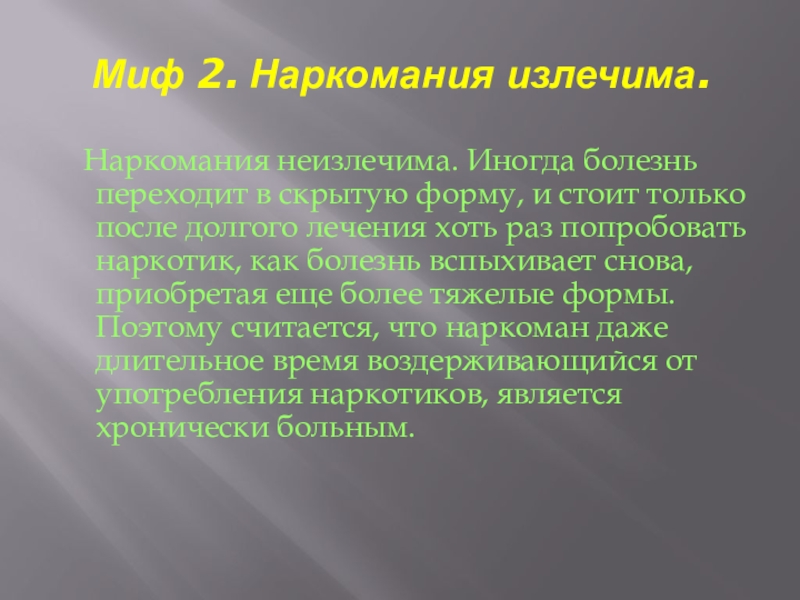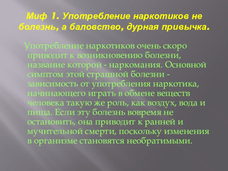 Слайд 17Миф 1. Употребление наркотиков не болезнь, а баловство, дурная привычка.