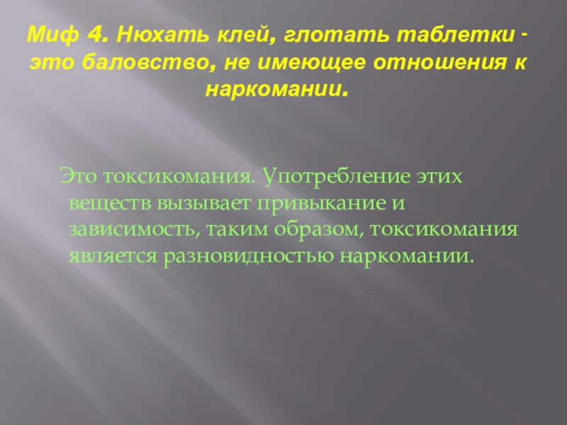 Слайд 21Миф 4. Нюхать клей, глотать таблетки - это баловство, не имеющее
