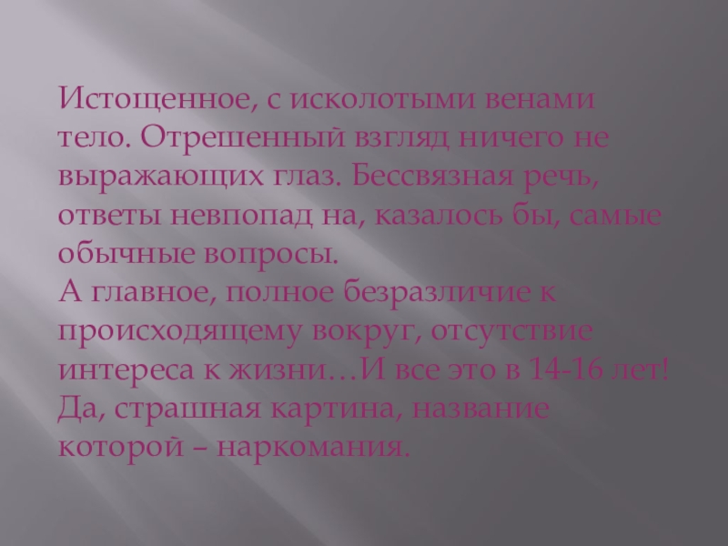 Слайд 2Истощенное, с исколотыми венами тело. Отрешенный взгляд ничего не выражающих глаз.