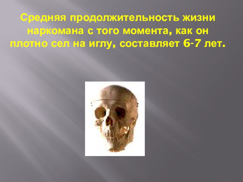 Слайд 3Средняя продолжительность жизни наркомана с того момента, как он плотно сел