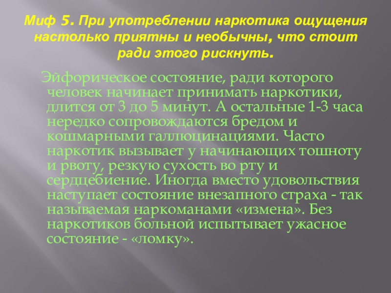 Слайд 22Миф 5. При употреблении наркотика ощущения настолько приятны и необычны, что