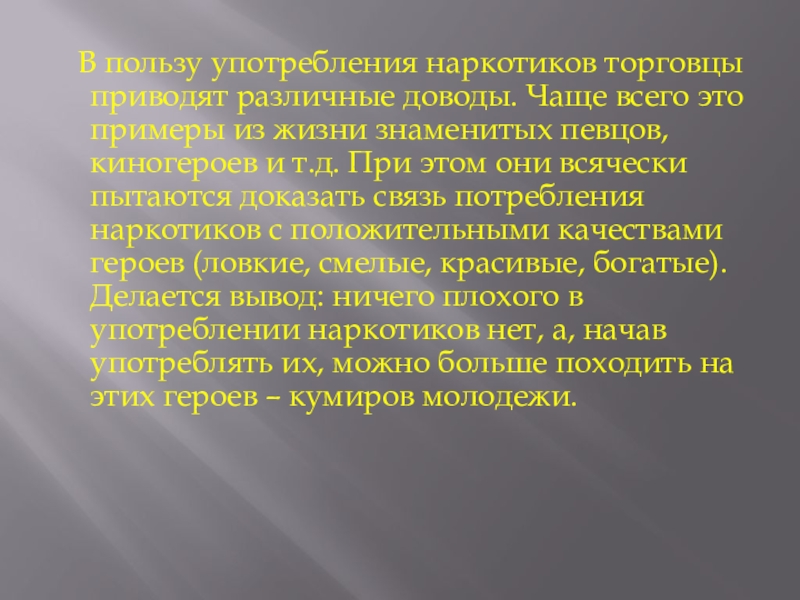 Слайд 20 В пользу употребления наркотиков торговцы приводят различные доводы. Чаще