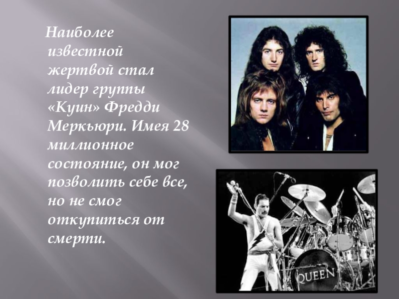 Слайд 12 Наиболее известной жертвой стал лидер группы «Куин» Фредди Меркьюри.
