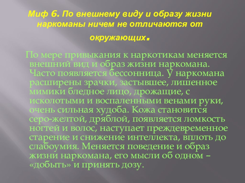 Слайд 23Миф 6. По внешнему виду и образу жизни наркоманы ничем не