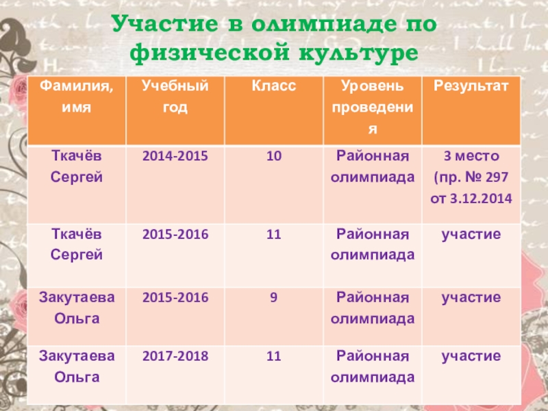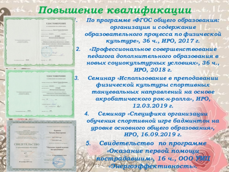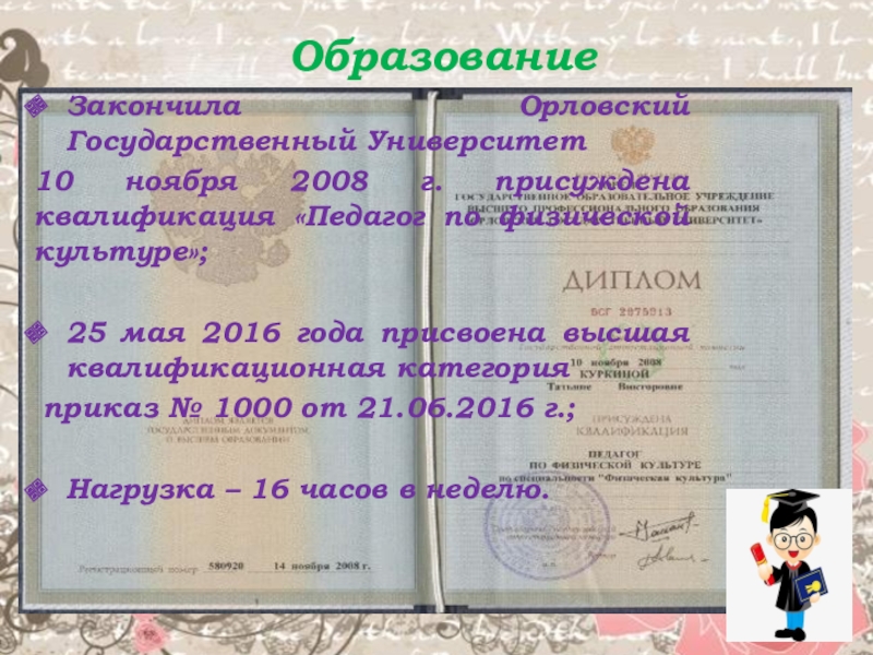 10 ноября 2008 г. присуждена квалификация «Педагог по физической культуре»;