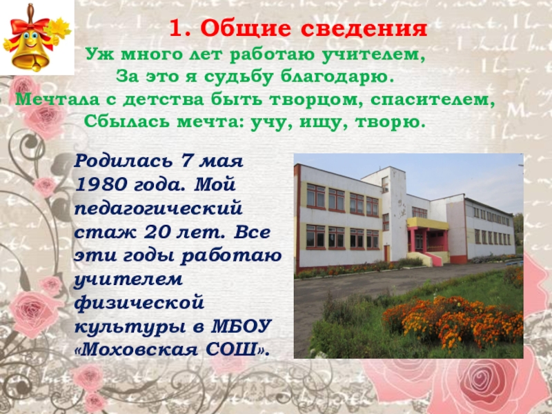 Родилась 7 мая 1980 года. Мой педагогический стаж 20 лет. Все эти годы работаю учителем физической культуры в МБОУ «Моховская СОШ».
