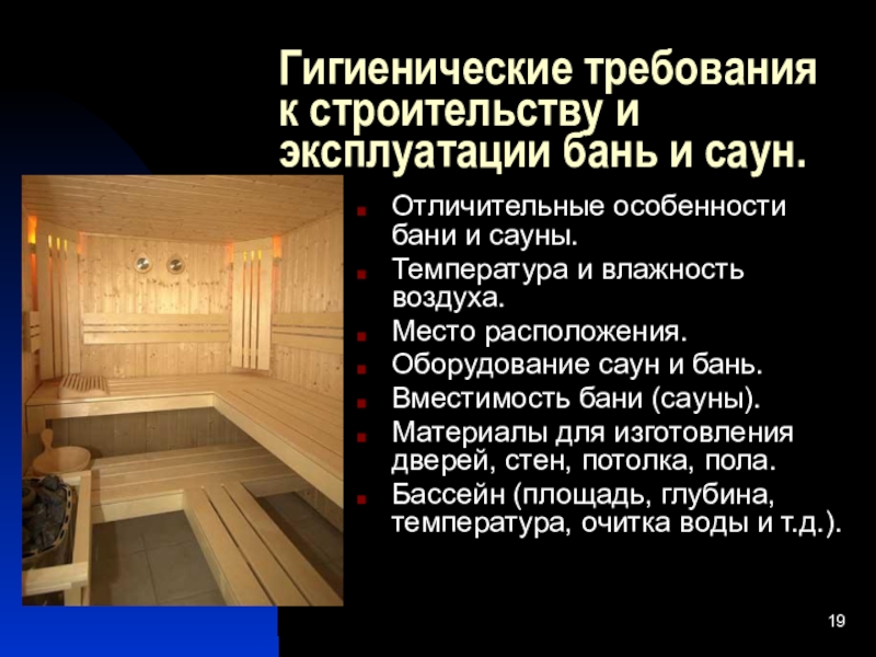Слайд 19Гигиенические требования к строительству и эксплуатации бань и саун.