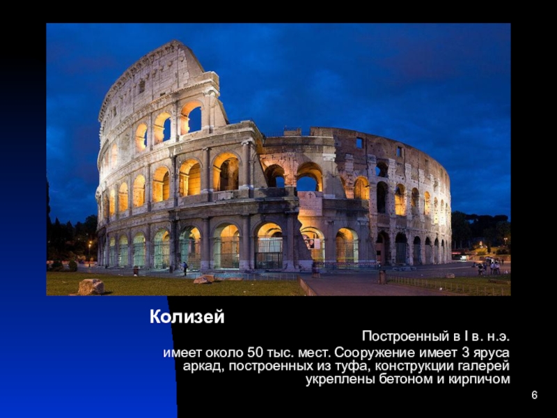 имеет 3 яруса аркад, построенных из туфа, конструкции галерей укреплены бетоном и кирпичом