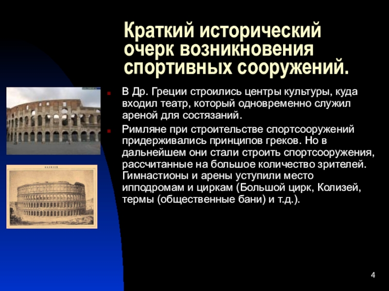 Слайд 4Краткий исторический очерк возникновения спортивных сооружений.