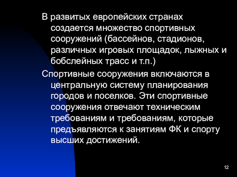 Слайд 12В развитых европейских странах создается множество спортивных сооружений (бассейнов, стадионов, различных