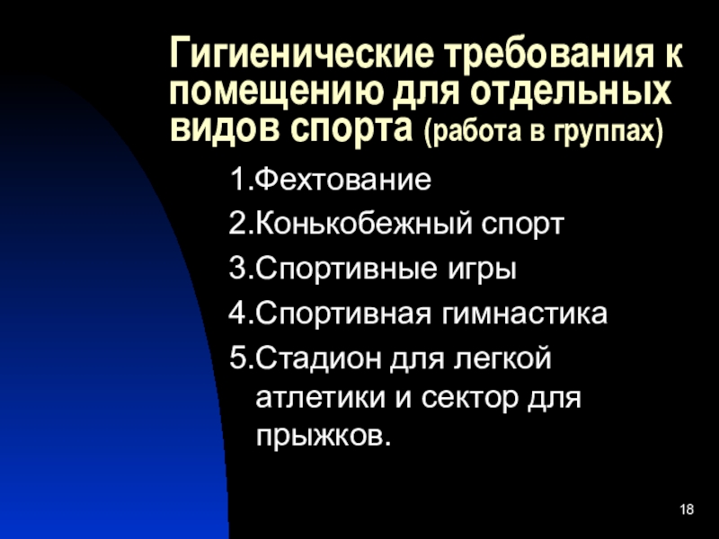 Слайд 18Гигиенические требования к помещению для отдельных видов спорта (работа в группах)
