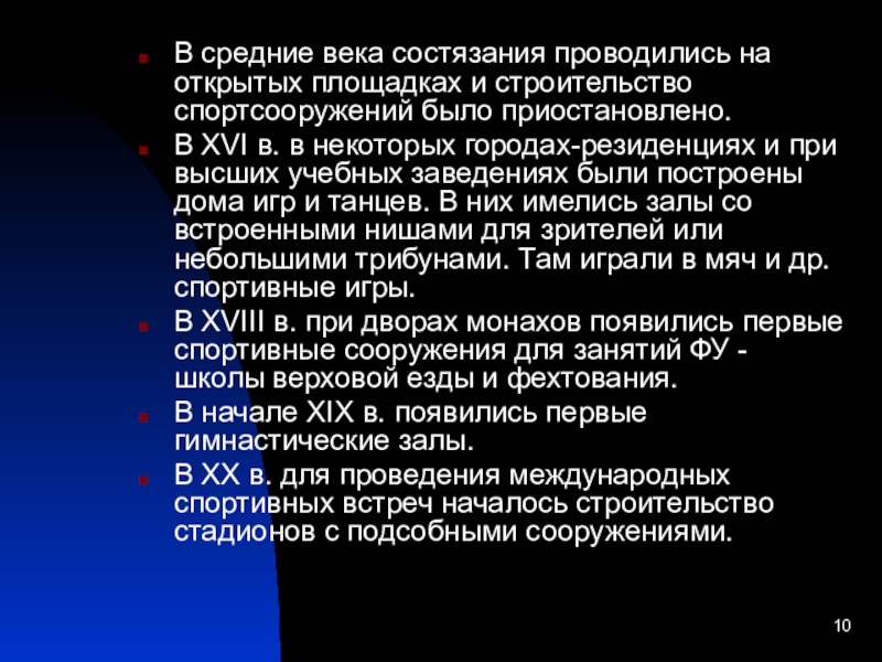Слайд 10В средние века состязания проводились на открытых площадках и строительство спортсооружений