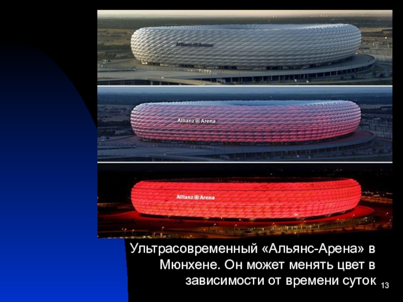 Слайд 13Ультрасовременный «Альянс-Арена» в Мюнхене. Он может менять цвет в зависимости от