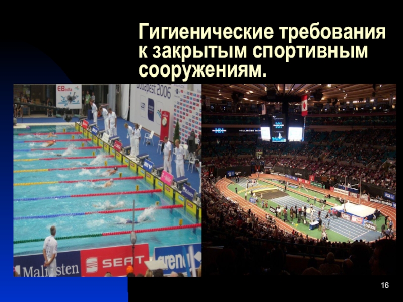 Слайд 16Гигиенические требования к закрытым спортивным сооружениям.